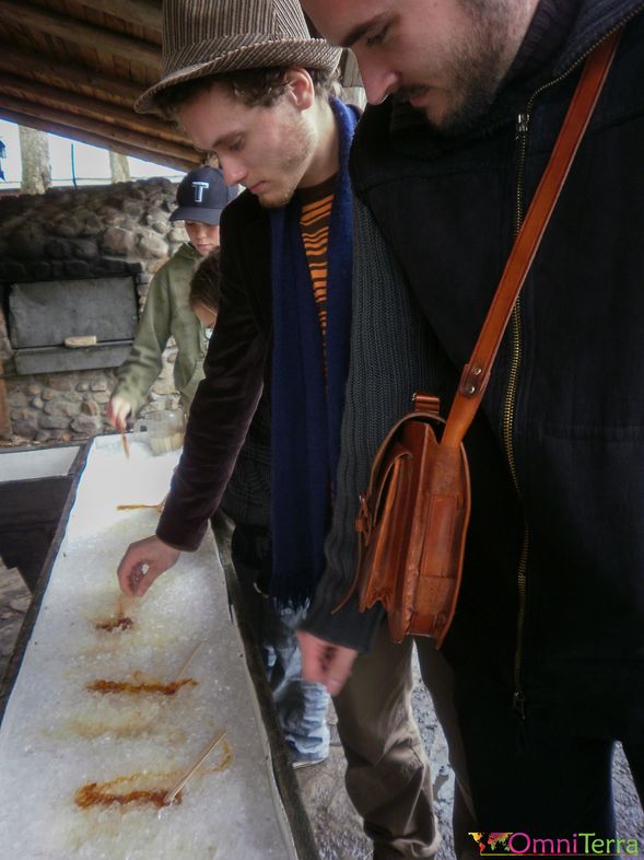 En sortant, un dernier délice vous attend : du sirop d’érable épais et encore chaud est mis à figer autour d’un bâtonnet directement sur la glace. C’est ce « suçon » d’érable que l’on appelle la tire sur neige.