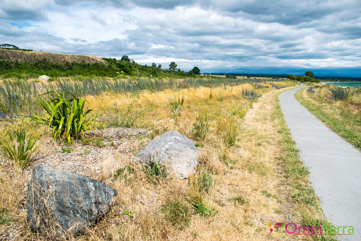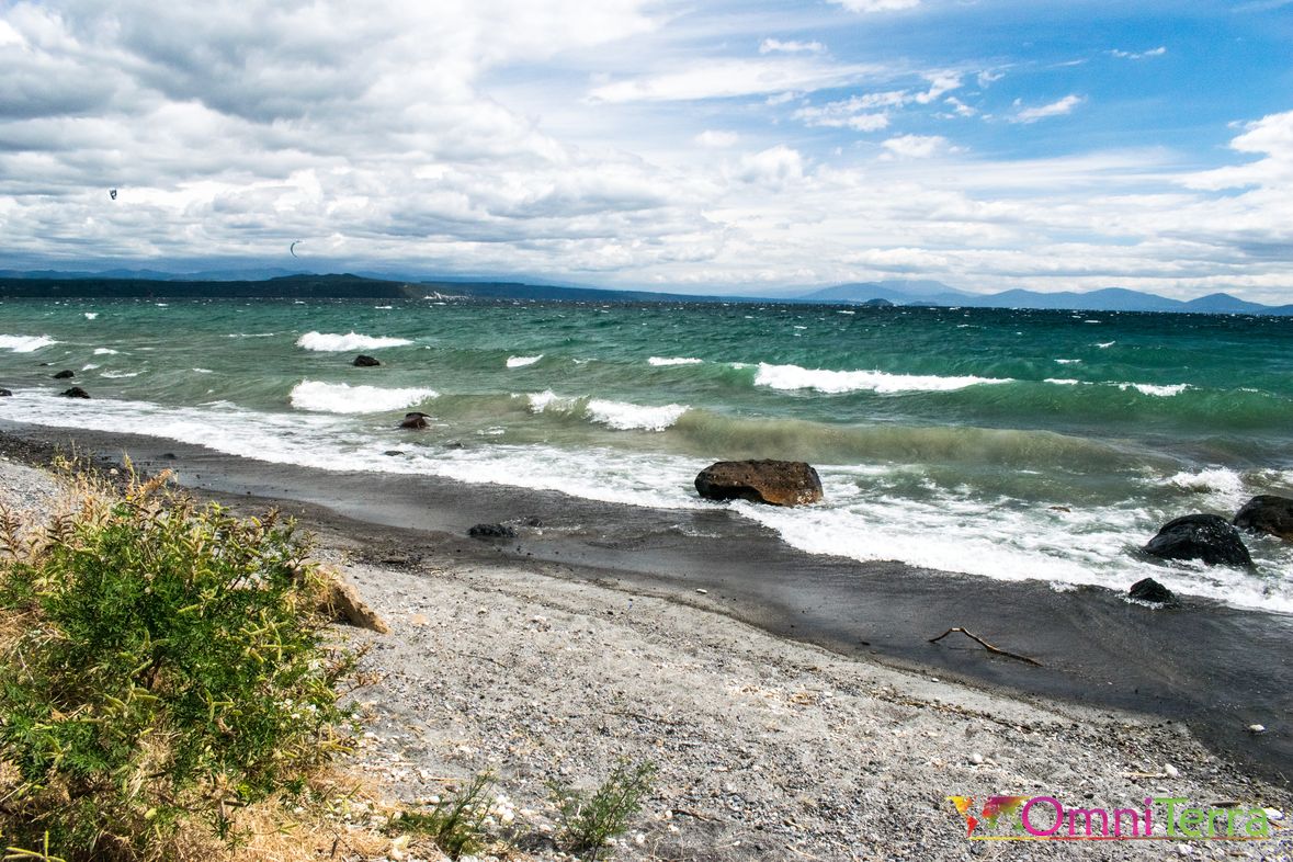 Le sentier, partagé entre cyclistes et piétons, court le long des berges du lac Taupo. Machinalement nous marchons à droite (détail qui peut sembler anecdotique mais qui finalement en dit long sur nos habitudes culturelles) jusqu’à ce qu’un vieux cycliste mécontent nous invective et nous arrache à nos rêveries de promeneurs presque solitaires. Le vent fouette l’eau et crée une houle puissante que des kitesurfeurs semblent apprécier. L’horizon est avalé par d’épais nuages. La balade de 7 kilomètres, tout en douceur, permet à nos corps, encore déphasés, de reprendre de saines habitudes.